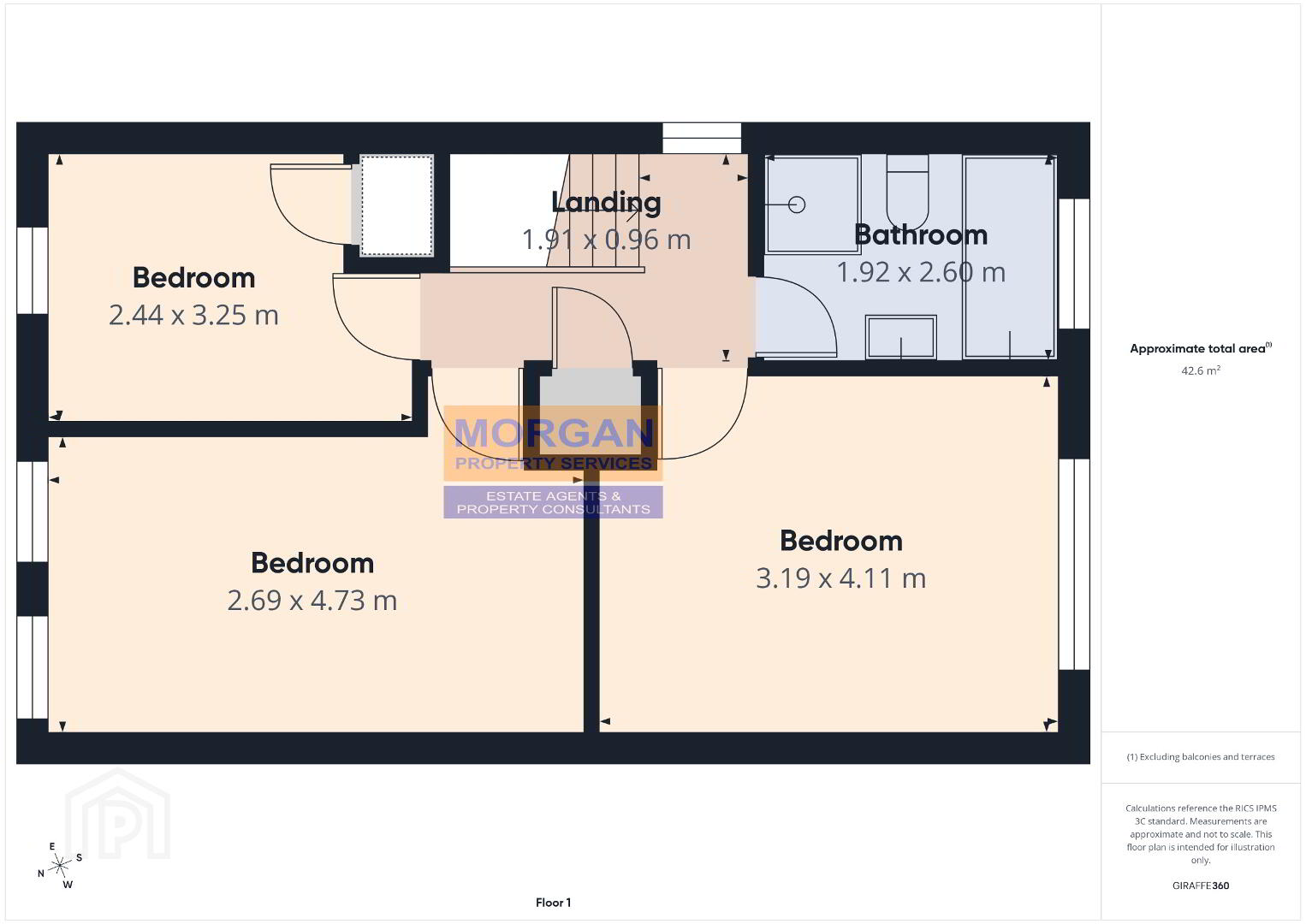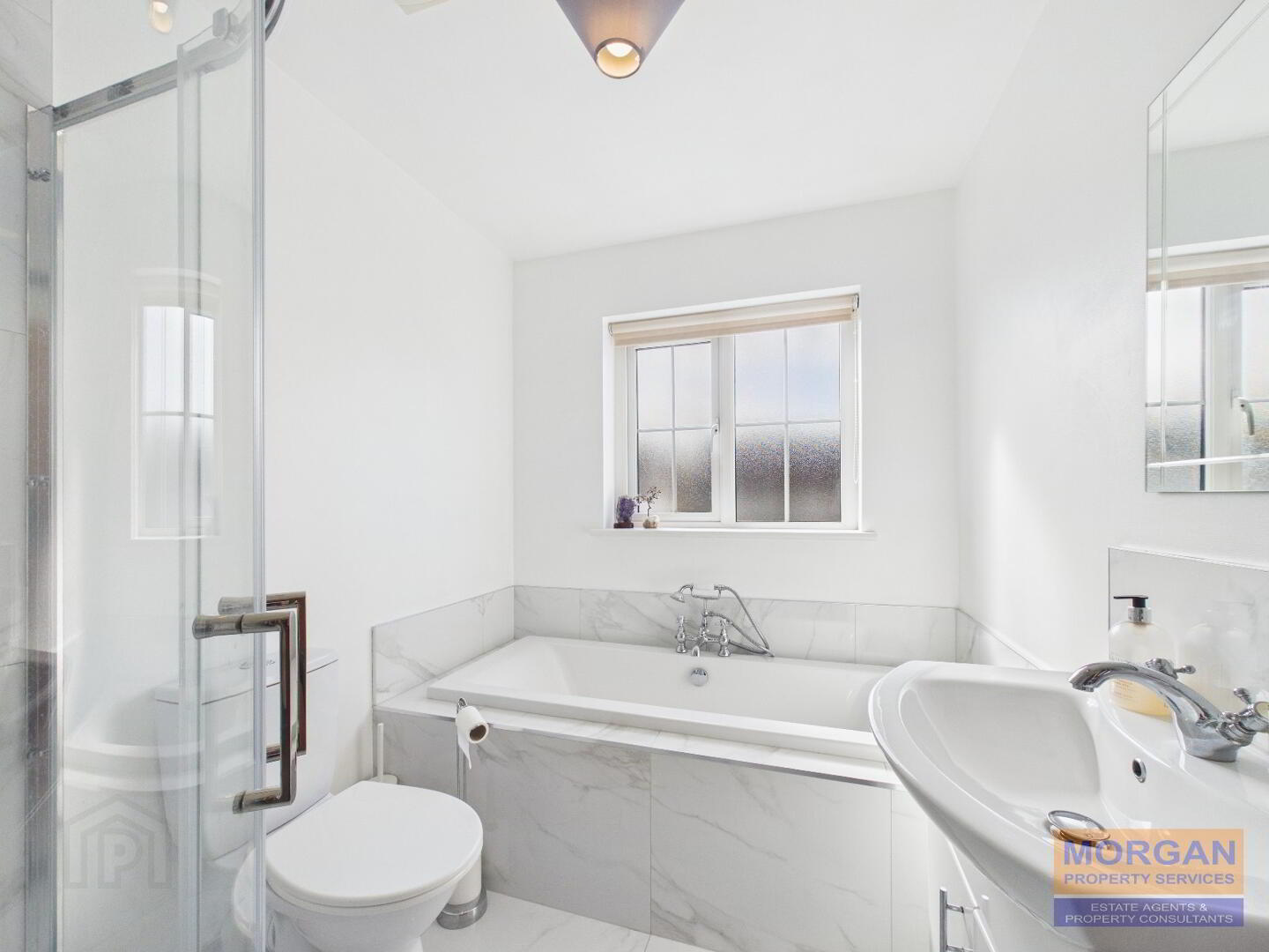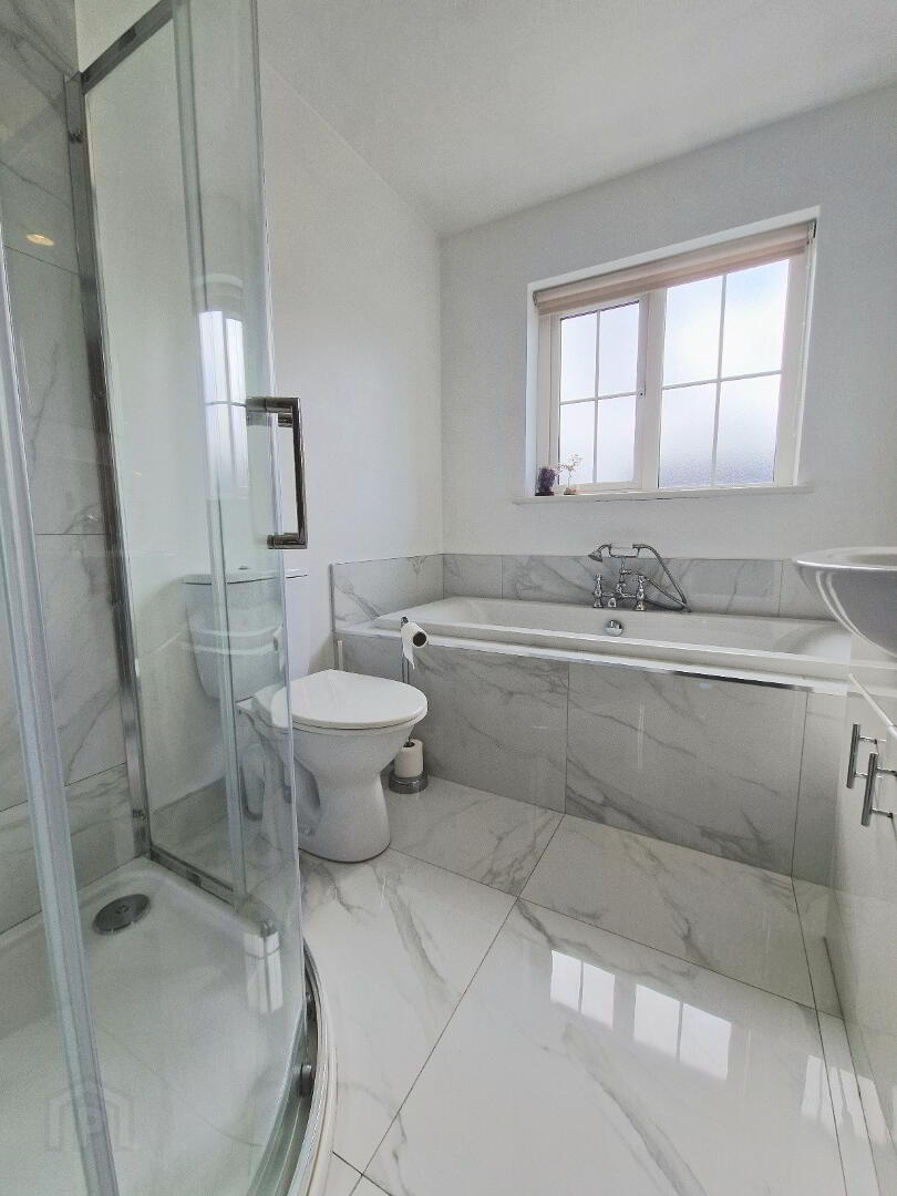 2.6m x 1.92m Stylish white suite comprises bath with chrome shower head and mixer taps, WC with dual flush, whb / vanity unit plus a separate large walk-in quadrant shower unit with chrome thermostatic shower fittings and glass surround. Part tiled walls. Tiled floor. Chrome heated towel rail. Shaver point. Wall mirror. Fan. Front aspect.
