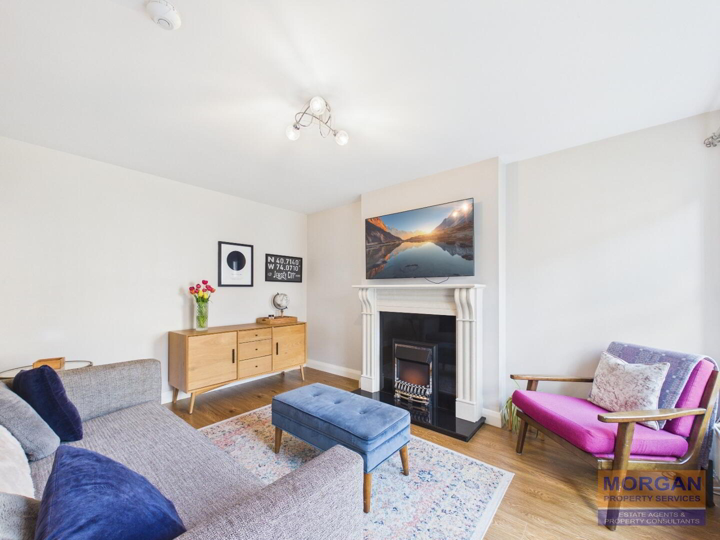 3.33m x 4.21m at widest. Feature fireplace with marble surround, black granite inset and hearth. Electric fire included. Oak laminate flooring. Double socket for for wall mounted TV over fireplace. Main light fitting. TV pt. Full fibre broadband modem. Front aspect.
