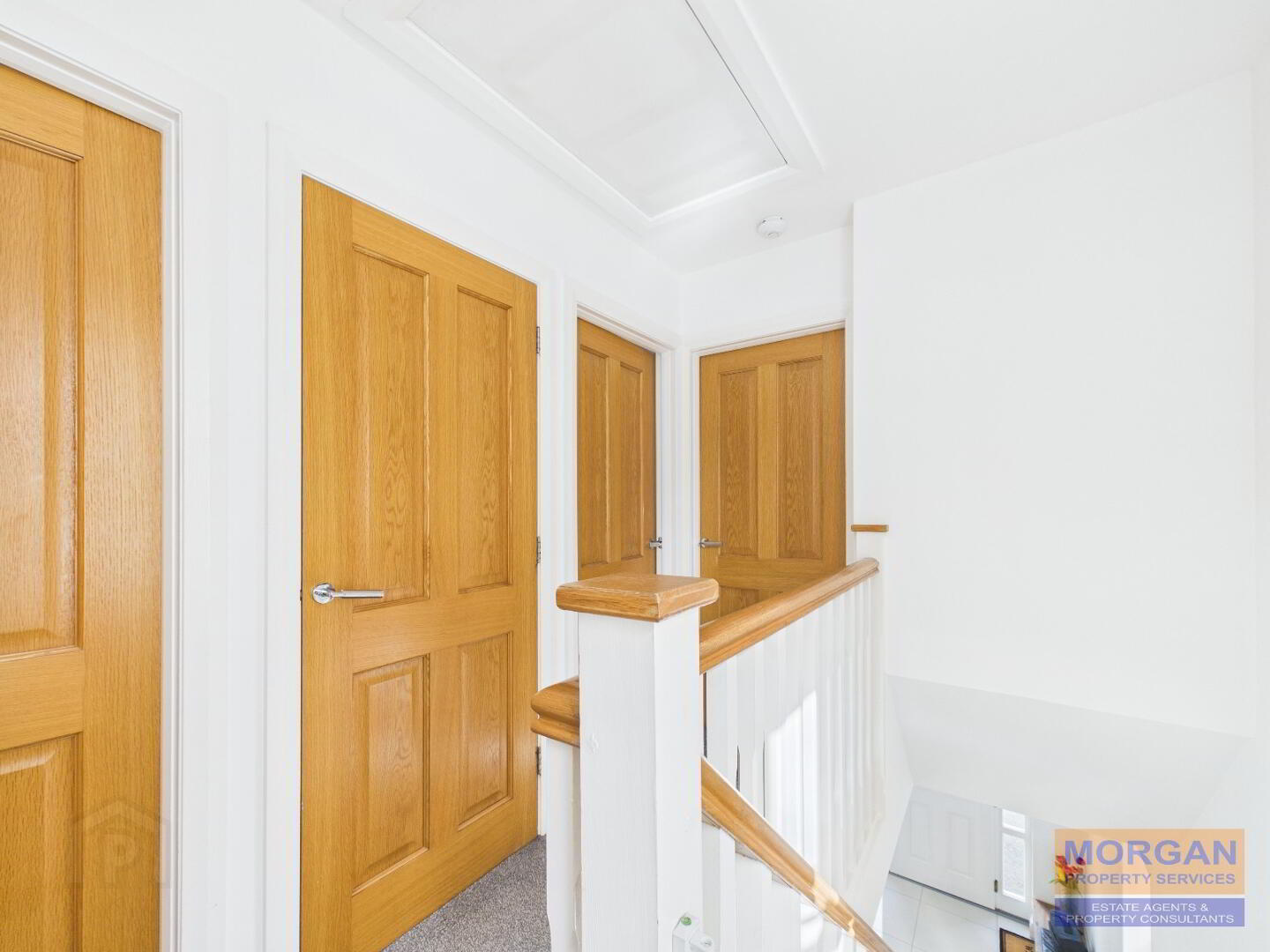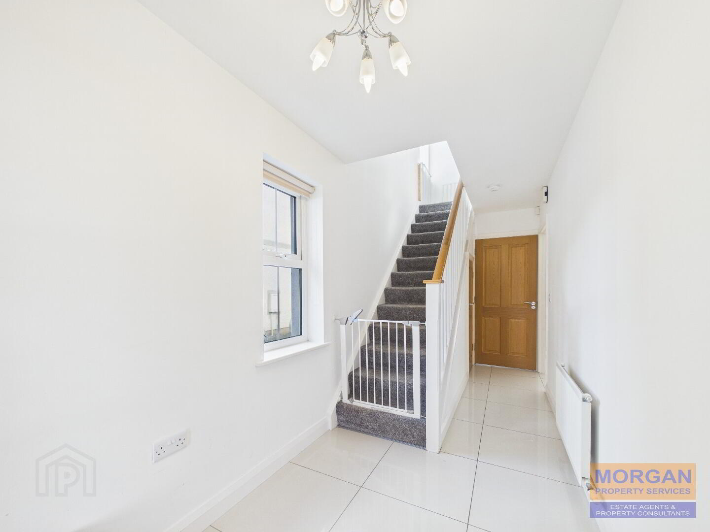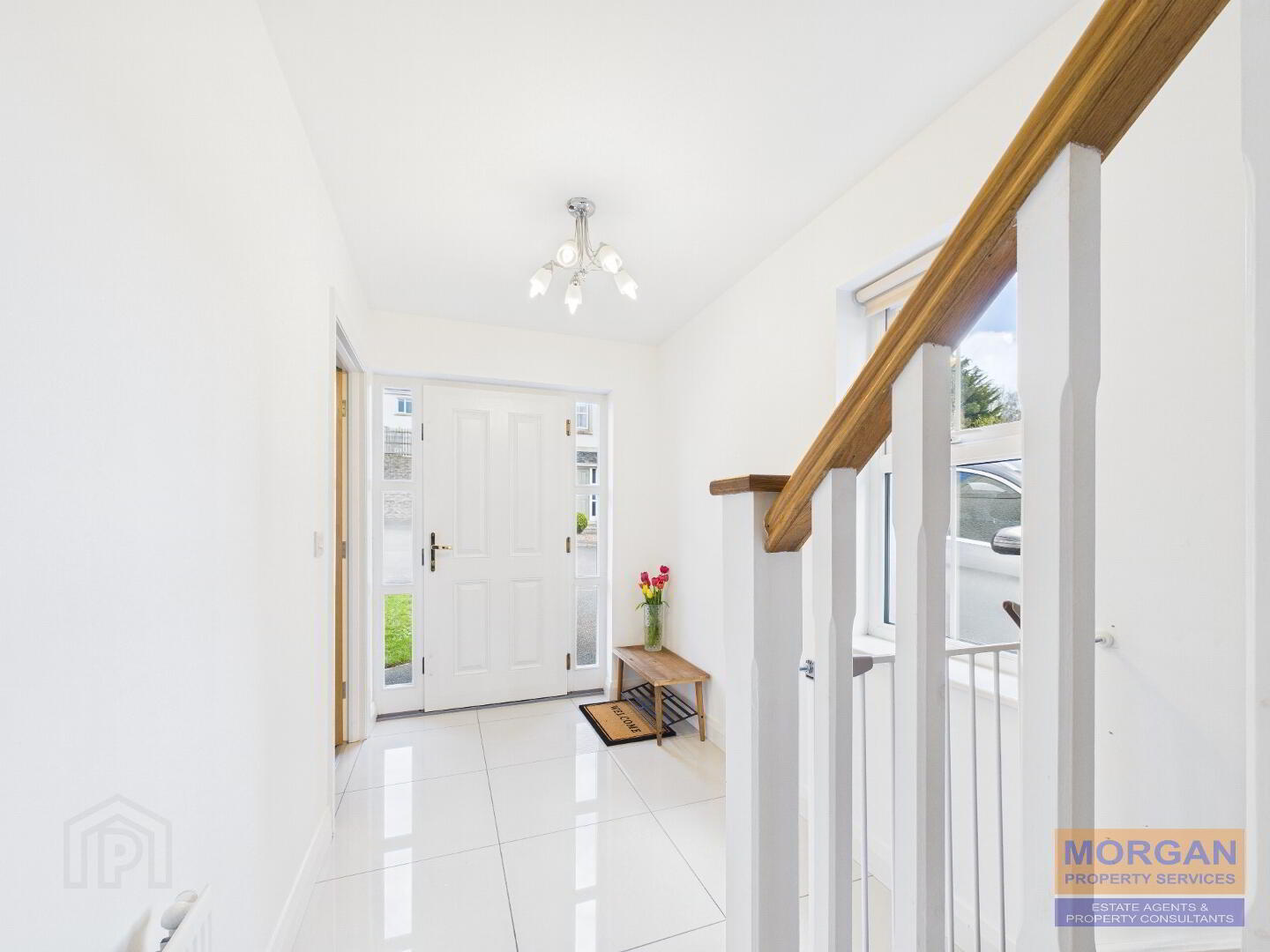 5.26m x 1.76m Composite front door with double side screen. Tiled floor. Feature staircase white timber balustrades and oak handrail. Carpet laid to stairs. Gable window. Storage under stairs. Toilet off.