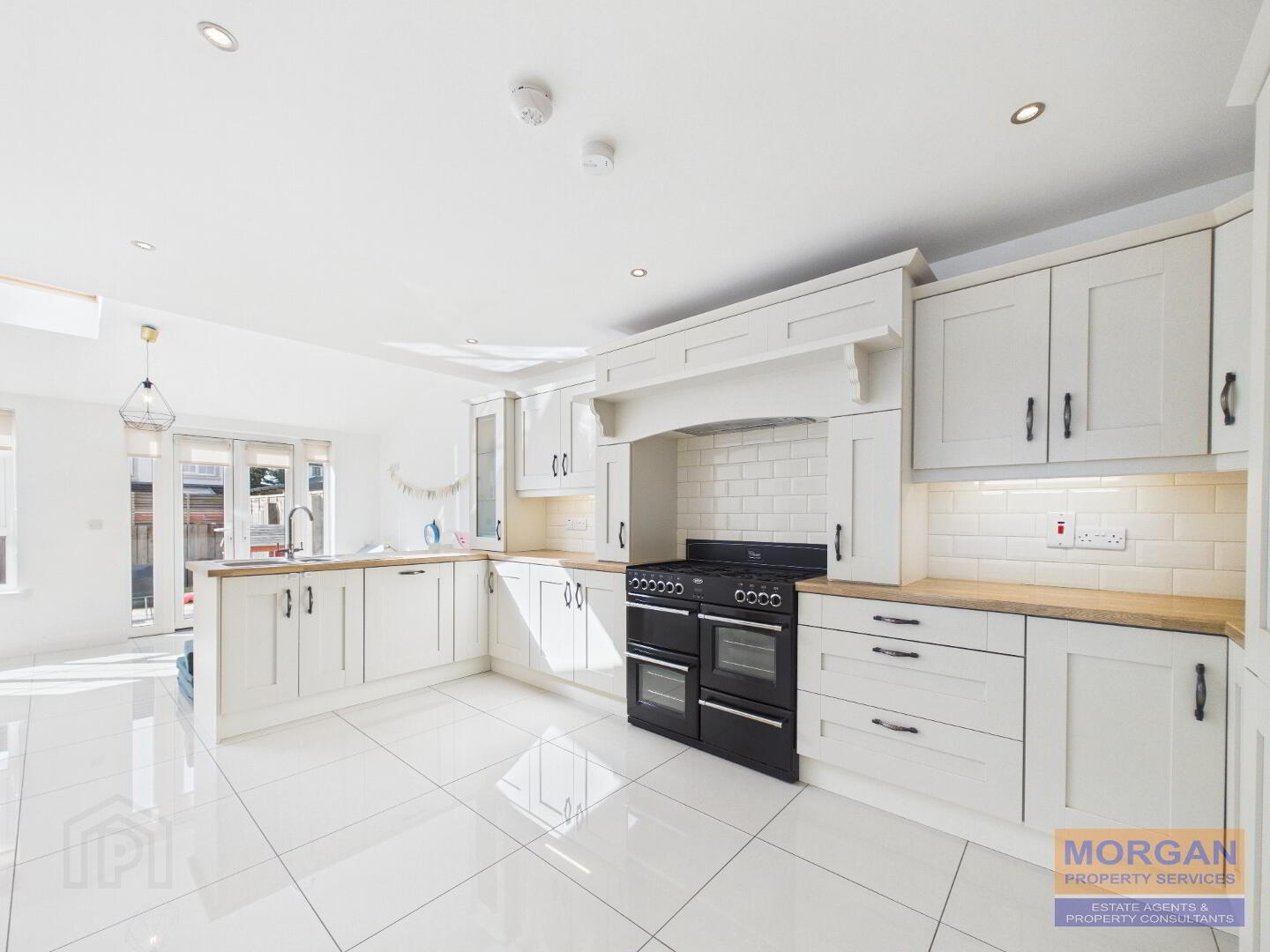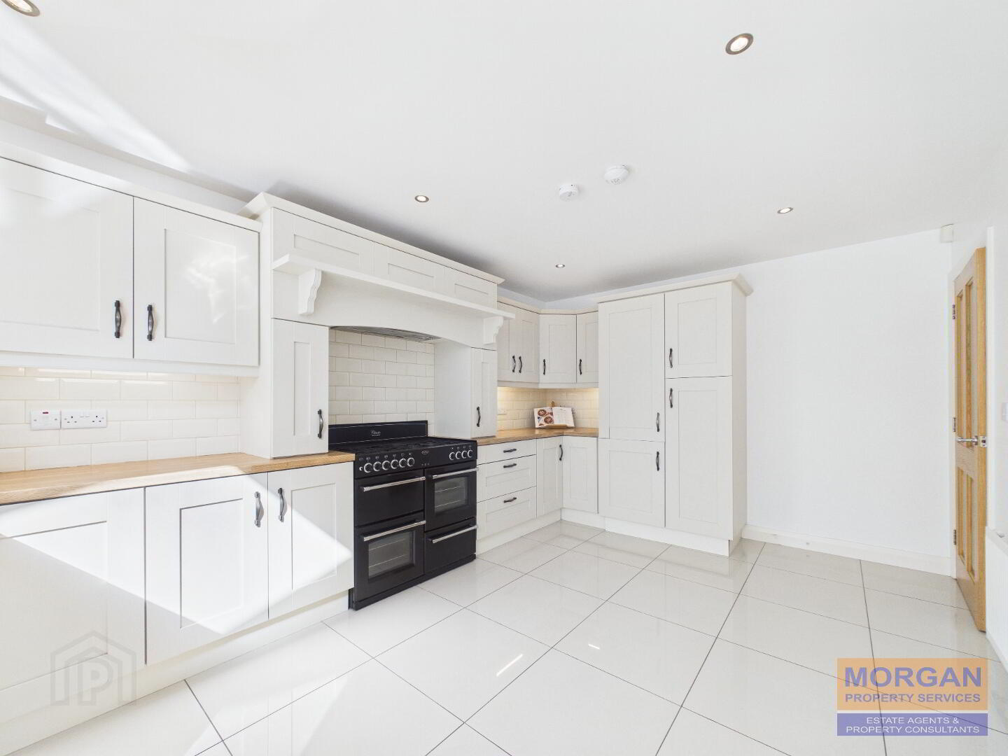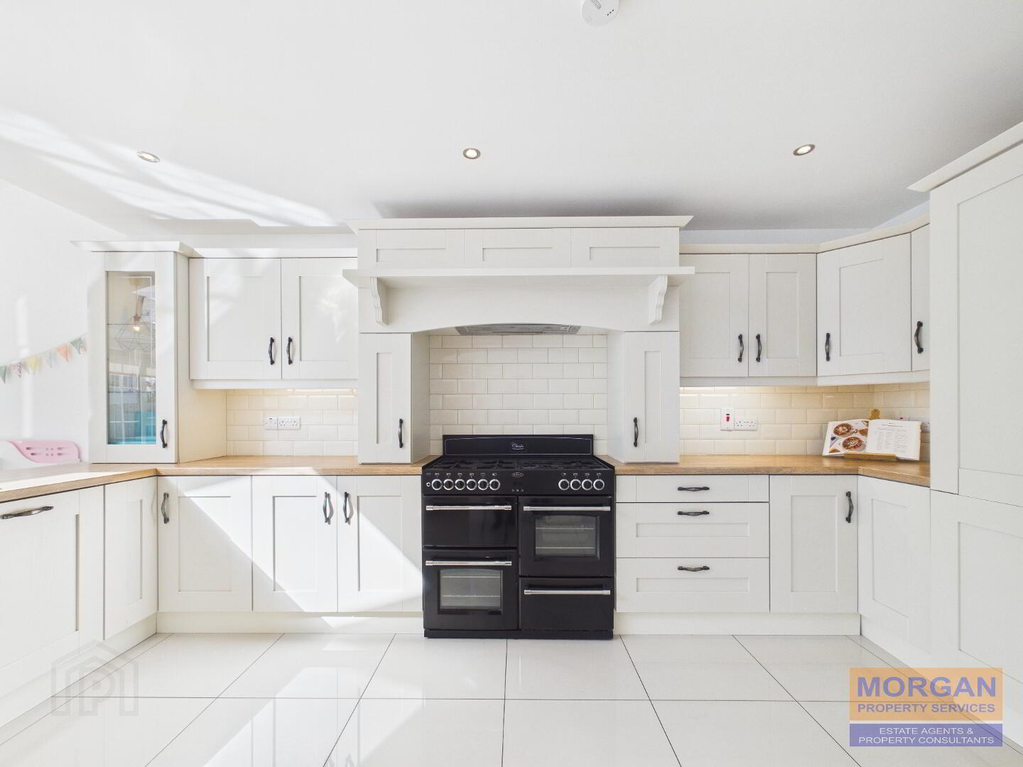 Kitchen 4.98m x 3.29m Stylish high and low level fitted kitchen units with glass display plus breakfast bar finished with attractive oak effect worktops. Wall tiled above worktops. Feature dual fuel range cooker with canopy fan hood over. Integrated fridge/freezer and dishwasher. 1 1/3 bowl sink unit and stylish tap set. Large floor tiles. Recessed ceiling spot lighting plus lighting under units.