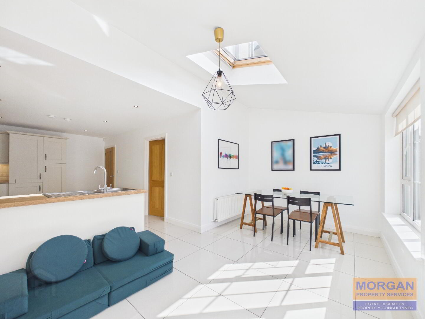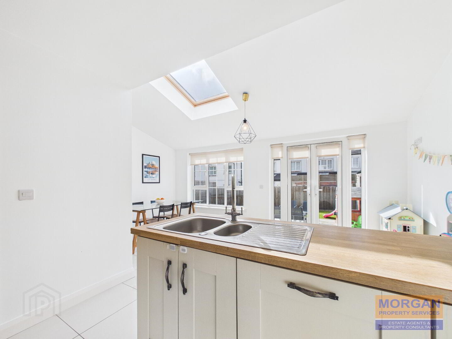 Dining / Living Area 5.18m x 2.65m Feature high vaulted ceiling with Velux window sky light. French patio doors leading to rear garden. TV pt. Tiled floor. Rear aspect.