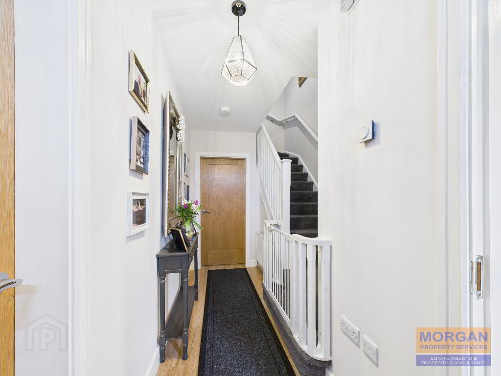 Hardwood glazed lever locking front door. Oak laminate flooring. Alarm key pad. Telephone pt. Toilet off. Staircase painted white with carpet laid to.