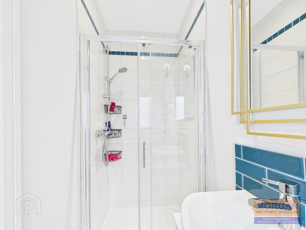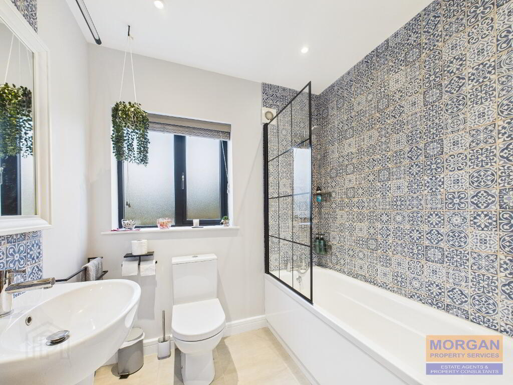 2.13m x 2.07m Stylish white bathroom suite comprises a bath with thermostatic shower fitting over and screen; WHB; and WC with dual flush. Part tiled walls. Tiled floor. Spot lighting. Wall light over whb. Fan. Towel rack. Rear aspect.